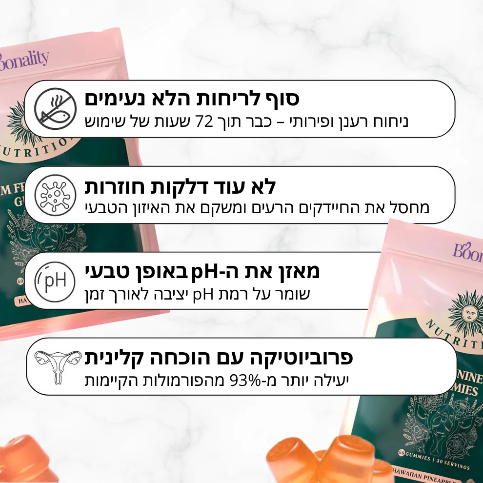 שילוב ייחודי של תמצית אננס טבעית עם פרוביוטיקה קלינית מוכחת – לטיפול שלם באיזון האינטימי שלך.